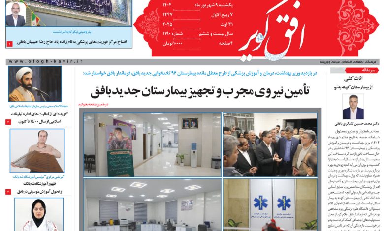 در بازديد وزير بهداشت، درمان و آموزش پزشکي از طرح معطل مانده بيمارستان 96 تختخوابي جديد بافق، فرماندار بافق خواستار شد: تأمين نيروي مجرب و تجهيز بيمارستان جديد بافق/سرمقاله: اثاث کشي از بيمارستان کهنه به نو/ بذر وصيتي نيکو که به ثمر نشست:افتتاح مرکز فوريت هاي پزشکي به نام زنده ياد حاج رضا حبيبيان بافقي/ حجت الاسلام سمتي، رئيس سازمان تبليغات اسلامي بافق: گزيده اي از فعاليت هاي اداره تبليغات اسلامي بافق از سال 1400 تاکنون/ “مرتضي مرکزي” مؤسس آموزشگاه شه بانگ: ظهور آموزشگاه شهبانگ و تحول آموزش موسيقي در بافق/ منيره اکبري، مربي کاراته: داشتن باشگاه کاراته آرزوي ديرينه من است/ حقوقی: تصادف مرگبار راننده بيپروا ، که دو زندگي را بلعيد/ طنز هفته: تکليف چيست؟ اگر عوارض نرسد!/ فرماندار شهرستان بافق: زيرساختهاي پهنه ي ريلي بهطور کامل مهيا شده است/ افتتاح و کلنگزني 16 طرح در مهريز به مناسبت هفته دولت/گفتگو با مادر سرباز شهید اقتدار: اين لباس بالانشيني من است/ مشاوره: آياشماهم بعنوان والددرمورداستفاده ازگوشي بافرزندت مشکل داري؟/ شعر: براي مرزبان غيور و سلحشور ايران