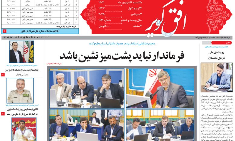 محمدرضا بابایی استاندار یزد در جمع فرمانداران استان مطرح کرد: فرماندار نباید پشت میزنشین باشد/ هفتمین جشنواره تابستانه بافق؛ رویدادی ملی در دل نخلستان/ آخرین پیگیری ها درباره فرمانداری ویژه بافق/ عملکرد کمیته امداد امام خمینی)ره( بافق در سال 1403حمایت از نیازمندان دهک های پایین معیشتی شهرستان بافق/ آخرین پیگیری ها درباره فرمانداری ویژه بافق/ شرکت سنگ آهن مرکزی بافق میزبان یازدهمین همایش ارزیابی بهره وری کشور شد/ اطلاعاتی درباره ویروس /(HPV)صدای افق/ مشاوره: عواقب سرزنش کودکان/ از سیاهی زندان تا روشنایی امید/ “حسین عباسیان”، مدیر اداره محیط زیست شهرستان بافق: تکثیرنیمه طبیعی یوزپلنگ آسیایی در اسارت ضروری به نظر می رسد/ علی حسینی ابراهیمی: از پیوند کودکی با جودو تا رؤیای طلای جهان/ کشف یک قبضه کلت کمری در مهمانی شبانه در یزد