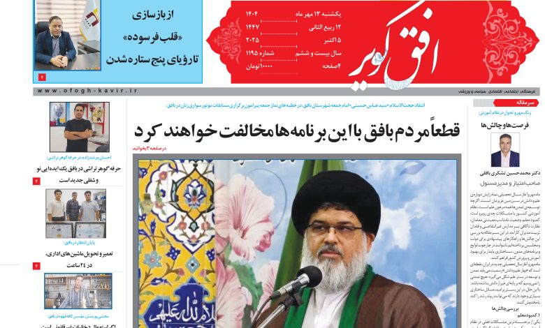 انتقاد حجت‌الاسلام «سيد عباس حسيني» امام جمعه شهرستان بافق، در خطبه هاي نماز جمعه پيرامون برگزاري مسابقات موتور سواري زنان در بافق: قطعاً مردم بافق با اين برنامه‌ها مخالفت خواهند کرد/ زنگ مهر و تحول در نظام آموزش: فرصت‌ها و چالش‌ها(سرمقاله)/ تکريم خانواده‌هاي معظم شهدا، ايثارگران و آزادگان شرکت سنگ‌آهن/تخصيص مبلغي حاصل از مزايده مکان‌هاي ورزشي به اداره ورزش و جوانان /تجليل از آتش‌نشانان و ايمن‌کاران بافق در روز ملي ايمني: قهرمانان خاموش در خط مقدم امنيت/هتل نيکان در آستانه تحول: از بازسازي «قلب فرسوده» تا رؤياي پنج ستاره شدن/احسان مرشدزاده، در حرفه گوهرتراشي: حرفه گوهرتراشي در بافق يک ايده‌ايي نو و شغلي جديد است/پايان انتظار در بافق؛ تعمير و تحويل ماشين‌هاي اداري، در 24 ساعت/مجتبي پورمنش، مؤسس کافه قهوه در بافق: اگر استعمال دخانيات غيرقانوني است ؛چرا در بومي گردي ها بدون مشکل است/فرمانده نيروي انتظامي شهرستان بافق تشريح نمود: استفاده از ظرفيت بومي و نيروهاي محلي کليد حل سرقت ها/ طنز هفته: جيب خالي و پز عالي /تاريخ بني اسراييل(شعر)/ فرمانده نيروي انتظامي بافق: مديران مدارس، زمان ورود و خروج دانش آموزان را به علت مسايل ترافيکي کنترل کنند
